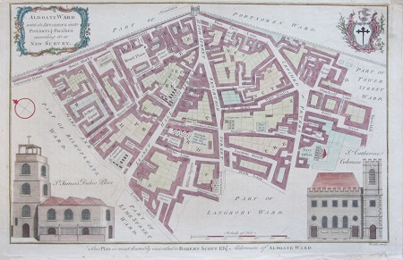 | M0406 | London | Aldgate Ward with its Division into Precints and Parishes according to a new Survey, 1755. Engraved by B Cole and published in William Maitland's 'History of London from its Foundation to the Present Time'. Copper engraving with later hand colouring. Includes views of the Parish Churches of St James's and St Catherine,Coleman. These ward plans were largely derived from Strype's plans. | h 235mm x w 360mm | £60 |  |